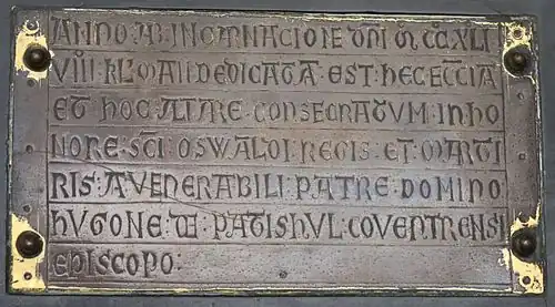 Hugh de Pateshull's name is recorded on the brass plate commemorating the dedication of St Oswald's Church, Ashbourne on 24 April 1241. | |