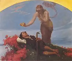 In Scandinavian mythology, Huld is only referenced by völva or seiðkona, that is a woman who practiced the seiðr. She is mentioned in the Ynglinga saga, Sturlunga saga and a late medieval Icelandic tale.[1] In the latter source, she is Odin's mistress and the mother of the demi-goddesses Þorgerðr and Irpa.[1] As her name suggests, Huld may be in origin the same being as the Hulder and the German Holda.[1]