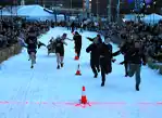 Each year, a field of approximately 32 teams compete against each other in a double elimination tournament to determine the National Human Dog Sled Champion. The teams consist of six persons including four sled pullers, a sled rider, and a sled pusher. The sled race is approximately 50 meters long and takes place along a snow-covered street in downtown Lowell. Team members often dress in wacky costumes and there is a prize for the most creative of attire.