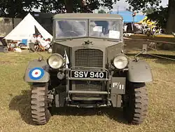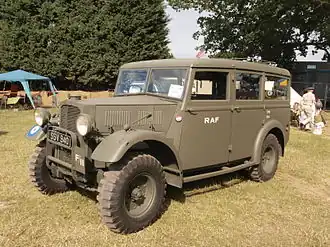 The Humber FWD (four wheel drive, sometimes written as F.W.D.) was designed for the British Army after the outbreak of World War II. Its design was partly derived from the Humber Super Snipe passenger car, incorporating elements such as the engine, independent front suspension, and gearbox.[2] The primary version was a heavy utility passenger off-road vehicle, officially designated as Car, Heavy Utility, 4x4 (FWD), Humber.[3] It was the only four-wheel-drive passenger car produced in the United Kingdom during the war.[1] Production began in May 1941 and continued until the end of the war,[4] with approximately 6,500 units manufactured.[2]