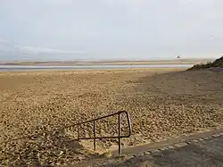 In the same year, the dunes were found to have been eroded by two thirds of their length because of strong waves. Around 260 tonnes of broken concrete and slag was used to shore up the weakest points and suggestions were made to further increase its stability, including building a higher and deeper sea wall between the dunes and the camp site, together with a clay bank on the beach.[55] Between 1961 and 1964 gabions and groynes costing £18,000 were built. However, within two years sand was scoured from the beach and the contents of the groynes washed out.[56]