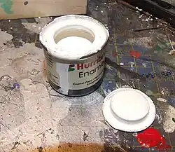 Humbrol is possibly best known for the enamel paints manufactured for use with plastic model kits, such as Airfix, Tamiya and Revell kits. The paints are manufactured in multiple finishes: matt, satin, gloss, metallic and metalcote. The archetypal container was a 14 ml tin with the lid illustrating the paint colour and an embossed reference number. Humbrol does, however, sell 50 and 120ml tins and spray cans in some colours. The 50ml enamel paint tins and spray paints remain available. The tins are called "Humbrol DIY".
