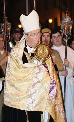 The humeral veil is also seen at the Mass of the Lord's Supper of the Catholic Church. It is used when the Ciborium containing the Blessed Sacrament is taken in procession to the place of reposition, and again when it is brought back to the altar without solemnity during the Good Friday service. The ritual for Requiem masses does not require the use of a humeral veil.[3] The exception to this is the Dominican Rite[4] which has a number of distinctive liturgical customs.