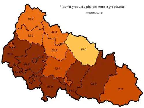 The Hungarians in Ukraine (Hungarian: Kárpátaljai magyarok, Ukrainian: угорці в Україні, tr. uhortsi v Ukraini) number 156,600 people according to the Ukrainian census of 2001 and are the third largest national minority in the country. Hungarians are largely concentrated in the Zakarpattia Oblast (particularly in Berehove Raion and Berehove city), where they form the largest minority at 12.1% of the population (12.7% when native language is concerned). In the area along the Ukrainian border with Hungary (the Tisza River valley), Hungarians form the majority.