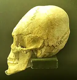 Many scholars take these to be unflattering depictions of East Asian (obsolete "Mongoloid") racial characteristics.[41] Maenchen-Helfen argues that, while many Huns had East Asian racial characteristics, they were unlikely to have looked as Asiatic as the Yakut or Tungus.[42] He notes that archaeological finds of presumed Huns suggest that they were a racially mixed group containing only some individuals with East Asian features.[43] Kim similarly cautions against seeing the Huns as a homogenous racial group,[44] while still arguing that they were "partially or predominantly of Mongoloid extraction (at least initially)."[45] Some archaeologists have argued that archaeological finds have failed to prove that the Huns had any "Mongoloid" features at all,[46] and some scholars have argued that the Huns were predominantly "Caucasian" in appearance.[47] Other archaeologists have argued that "Mongoloid" features are found primarily among members of the Hunnic aristocracy,[48] which, however, also included Germanic leaders who were integrated into the Hun polity.[49] Kim argues that the composition of the Huns became progressively more "Caucasian" during their time in Europe; he notes that by the Battle of Chalons (451), "the vast majority" of Attila's entourage and troops appears to have been of European origin, while Attila himself seems to have had East Asian features.[50]