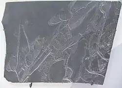 Many types of fishes have been described from the Hunsruck slate. Several genera of placoderm armoured fish have been recorded, including some preserved in three dimensions.[9] Agnathan jawless fishes are the most commonly preserved vertebrates, particularly the flattened Drepanaspis, notable for its upwards-facing mouth, and the streamlined Pteraspis. Spines from acanthodii[10] spiny sharks and a single sarcopterygian lobe-fin specimen are also known.[11][8]