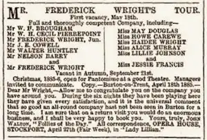- ^ The Era, 26 October 1889, p. 9. There was already an established comic actor in the English provinces with the name Walter Wright: see, e.g., The Era, 18 October 1884, p. 6 and 14 March 1885, p. 16, and so Wright used the stage names Walter Huntley, Huntley Wright and occasionally W Huntley-Wright: see The Era, 4 January 1890, p. 15