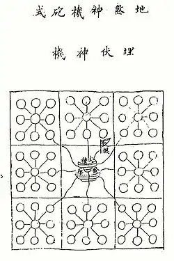 The fire lance or fire tube—a combination of a firearm and flamethrower[36]—had been adapted and changed into several different forms by the time Jiao Yu edited the Huolongjing.[37] The earliest depiction of a fire lance is dated c. 950, a Chinese painting on a silk banner found at the Buddhist site of Dunhuang.[38] These early fire lances were made of bamboo tubes, but metal barrels had appeared during the 13th century, and shot gunpowder flames along with "coviative" projectiles such as small porcelain shards or metal scraps.[39] The first metal barrels were not designed to withstand high-nitrate gunpowder and a bore-filling projectile; rather, they were designed for the low-nitrate flamethrower fire lance that shot small coviative missiles.[40] This was called the "bandit-striking penetrating gun" (ji zei bian chong).[40] Some of these low–nitrate gunpowder flamethrowers used poisonous mixtures such as arsenious oxide, and would blast a spray of porcelain shards as fragmentation.[41][19] Another fire lance described in the Huolongjing was called the 'lotus bunch' shot arrows accompanied by a fiery blast.[42] In addition to fire lances, the Huolongjing also illustrates a tall, vertical, mobile shield used to hide and protect infantry, known as the "mysteriously moving phalanx-breaking fierce-flame sword-shield".[43] This large, rectangular shield would have been mounted on wheels with five rows of six circular holes each where the fire lances could be placed. The shield itself would have been accompanied by swordsmen on either side to protect the gunmen.[43]