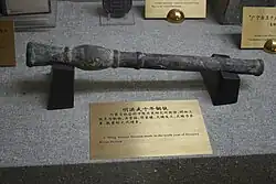 In China, the first cannon-barrel design portrayed in artwork was a stone sculpture dated to 1128 found in Sichuan province.[44] The oldest extant cannon containing an inscription is a bronze cannon of China inscribed with the date, "2nd year of the Dade era, Yuan dynasty" (1298). The oldest confirmed extant cannon is the Heilongjiang hand cannon, dated to 1288 using contextual evidence.[45] The History of Yuan records that in that year a rebellion of the Christian Mongol prince Nayan broke out and the Jurchen commander Li Ting who, along with a Korean brigade conscripted by Kublai Khan, suppressed Nayan's rebellion using hand cannons and portable bombards.[46]