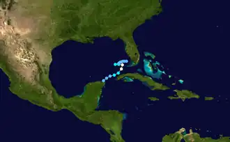 In late May, a tropical disturbance gradually developed over the northwestern portion of the Caribbean. It drifted westward into the Yucatán Peninsula, and on June 1 the convection organized into a circular cloud pattern in association with a low pressure system. The system tracked northeastward into the Gulf of Mexico while continuing to organize, and subsequent to the formation of a low-level circulation it developed into Tropical Depression One while located about 40 miles (64 km) north-northwest of Cancún. Reconnaissance Aircraft confirmed the existence of the tropical depression later that day.[2] Early on June 3, it is estimated the depression intensified into Tropical Storm Alberto while located about 150 miles (240 km) north-northwest of the western tip of Cuba, based on a ship report of 45 mph (72 km/h) winds about 115 miles (185 km) south of its center.[3] An Air Force flight was scheduled into the storm, though was forbidden by the Cuban government due to its presence in Cuban airspace.[4]
