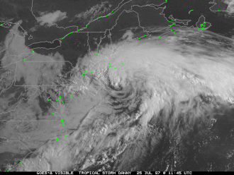 Hurricane Danny was the only hurricane to make landfall in the United States during the 1997 Atlantic hurricane season, and the second hurricane and fourth tropical storm of the season. The system became the earliest-formed fifth tropical or subtropical storm of the Atlantic season in history when it attained tropical storm strength on July 17, and held that record until the 2005 Atlantic hurricane season when Tropical Storm Emily broke that record by several days. Like the previous four tropical or subtropical cyclones of the season, Danny had a non-tropical origin, after a trough spawned convection that entered the warm waters of the Gulf of Mexico. Danny was guided northeast through the Gulf of Mexico by two high pressure areas, a rare occurrence in the middle of July. After making landfall on the Gulf Coast, Danny tracked across the southeastern United States and ultimately affected parts of New England with rain and wind.