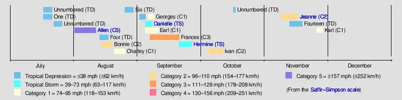 The three most notable storms of the season were Hurricane Allen, Tropical Storm Hermine, and Hurricane Jeanne. Allen was the then-earliest Category 5 hurricane in the calendar year on record, reaching that intensity on August 5. The storm devastated portions of the Caribbean, Mexico, and the United States. Overall, Allen caused about $1.57 billion and at least 269 deaths. Hermine caused significant flooding in southern Mexico, which resulted in at least 38 fatalities. Jeanne was one of only a few tropical cyclones to enter the Gulf of Mexico at hurricane intensity and not make landfall.