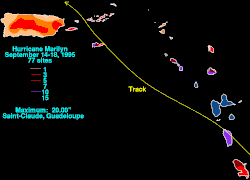 Hurricane Marilyn moved directly across Îles des Saintes and the southern part of Basse-Terre Island in the night of September 14–15, 1995,[3] bringing the highest known rainfall totals to the island from a tropical cyclone. Rainfalls over 12-hours in Guadeloupe were up to 20 in (510 mm) in Saint-Claude, 19.09 in (485 mm) in Guillard-Basse-Terre and 17.63 in (448 mm) in Gaba. The highest wind gust reported in Guadeloupe was 84 mph (135 km/h) in Marie-Galante. The next ones were near 52 mph (84 km/h) in Raizet with maximal wind gust at 68 and 61 mph (109 and 98 km/h) in Desirade.[3] Minimal pressure recorded at 989 mbar (29.2 inHg) in Basse-Terre.