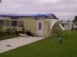 Farther north, two tornadoes were spawned in the Hobe Sound area on October 29, both rated EF0 on the Enhanced Fujita scale. The first tornado damaged 42 mobile homes, with one losing its roof, which was carried approximately 150 ft (46 m) downwind. Two vehicles were damaged and several trees were uprooted or lost branches. The other tornado caused similar impact, with a number of mobile homes damaged. After briefly lifting, the tornado touched-down again in a heavily wooded community, stripping branches from several trees. While crossing the Intracoastal Waterway, the tornado damaged five boats, one of which recorded a 75 mph (121 km/h) wind gust.[18] Throughout Florida, damage reached approximately $2.3 million.[19]