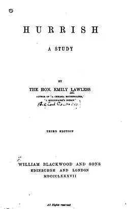 - Lawless, Emily (1887). Hurrish: A Study. 3rd ed. Edinburgh and London: William Blackwood and Sons. 342 pages.