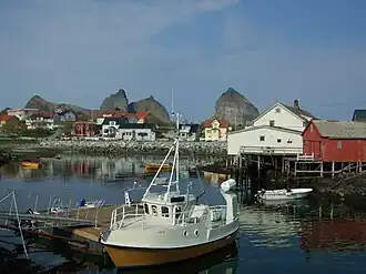 Husøya harbor with the Sanna mountains in the background. | |