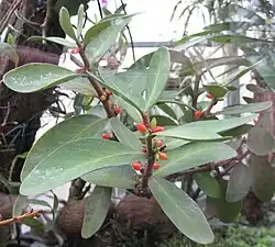 Hydnophytum formicarum has morphological structures that benefit ants, resulting in a mutualistic relationship between the two, making the plant a myrmecophyte.[2][3] These structures include the domatia, hollow chambers along the roots and leaves of the plant, and the caudex, an enlarged stem-like structure.[2][4] The domatia and caudex provide shelter for the ants, which is a major benefit to the ants as it protects them from external forces such as environmental factors or predation. Although the formation of these structures is energetically costly, the plant benefits as the caudex is a site where ants defecate and deposit debris.[4] The caudex, in particular, requires great investment from the plant as it requires greater biomass compared to the rest of the plant and can cause it to fall from the surface it is growing on. The plant has evolved to grow a caudex as the benefits of ants outweighs the costs.[4] Ant defecation is beneficial to the plant as the plant can absorb nutrients from it as well as the gases the ants release. Ants have high diets in animal tissue which is correlated to a faster release of nutrients and they trim encroaching vegetation.[4] The cells lining the nest show layers enriched with endoplasmic reticulum, dictyosomes, mitochondria and higher levels of enzymes associated with absorptive surfaces. The plant receives ammonia, carbon dioxide, calcium and nitrogen from the ants, shown by radioactive tests as these nutrients move throughout the plant.[5] These are all heavily reliant processes for this plant that usually occupies areas of otherwise nutrient deficient soil.[6]