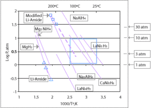 The release temperature of a material is defined as the temperature at which the desorption process begins. The energy or temperature to induce release affects the cost of any chemical storage strategy. If the hydrogen is bound too weakly, the pressure needed for regeneration is high, thereby cancelling any energy savings. The target for onboard hydrogen fuel systems is roughly <100 °C for release and <700 bar for recharge (20–60 kJ/mol H2).[14] A modified van 't Hoff equation, relates temperature and partial pressure of hydrogen during the desorption process. The modifications to the standard equation are related to size effects at the nanoscale.