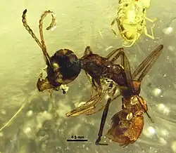 - ^ a b c d e f g h i j Barden, P.; Grimaldi, D.A. (2014). "A Diverse Ant Fauna from the Mid-Cretaceous of Myanmar (Hymenoptera: Formicidae)". PLOS ONE. 9 (4): e93627. Bibcode:2014PLoSO...993627B. doi:10.1371/journal.pone.0093627. PMC 3974876. PMID 24699881.