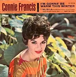 "I'm Gonna Be Warm This Winter" is one of the few Connie Francis hits remade by the singer in French, that rendering titled "L'Amour Est Un Cadeau Du Ciel" being recorded February 10, 1963. Unlike the English original, both single vocal and harmony vocal versions of the French interpretation were marketed in Canada and France.[1] In June 1963 Francis overdubbed a Japanese vocal on the track of "I'm Gonna Be Warm This Winter" with the resultant track entitled 想い出の冬休み (romanized spelling: Omoide No Fuyuyasumi) (Winter of '42);[2] Francis had overdubbed an Italian vocal on the track of "I'm Gonna Be Warm This Winter" on February 25, 1963, with the resultant track: "Sul monti blu" (The blue mountains)[3] never being released.