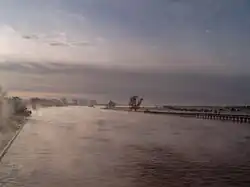 The IJssel (Dutch: [ˈɛisəl] ⓘ; Dutch Low Saxon: Iessel(t) [ˈisəl(t)]) is a Dutch distributary of the river Rhine that flows northward and ultimately discharges into the IJsselmeer (before the 1932 completion of the Afsluitdijk known as the Zuiderzee), a North Sea natural harbour. It more immediately flows into the east-south channel around the Flevopolder, Flevoland which is kept at 3 metres below sea level. This body of water is then pumped up into the IJsselmeer.