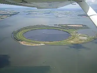 The dredgings are being stored in a man-made island depot in the middle of the Ketelmeer. One kilometer across and fifty meters deep, the depot is designed to hold 23 million cubic meters of sludge, of which 15 million cubic metres from the Ketelmeer, and the rest from elsewhere.[1] To prevent leakage, the floor of the depot is sealed with clay and the dike is lined with foil. The water level is held below that of the lake, to prevent pollution runoff.