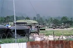 It was imperative to get 10 FSB to Dili before unit-level supplies and the reserves held by the Land Component Support Group had been consumed.[93] A seven-man reconnaissance party led by Kehoe flew from Townsville to Darwin via Brisbane on a Qantas flight on 26 September, and thence to Dili on a French C-130H the next day.[94] Kehoe decided to establish 10 FSB at the port, despite the risk involved in storing ammunition there.[95] He flew back to Darwin to meet the Advance Party, who flew direct to Darwin from Garbutt Airport on an Air Niugini aircraft on 30 September, and then travelled to Dili overnight on HMAS Jervis Bay. The main body followed by the same route on 8 October.[94]