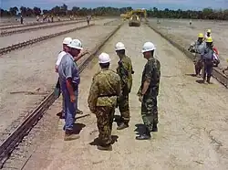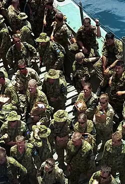 At an early stage it was appreciated that what little infrastructure there was in East Timor was being destroyed by the pro-Indonesia militia,[105] but there was no engineering staff at DJFHQ.[76] The ADF's engineering capability had been reduced by defence cuts, but the Army still maintained two construction squadrons, largely thanks to its involvement in the Aboriginal and Torres Strait Islander Commission's Army Community Assistance Program (AACAP), which provided facilities for indigenous communities in remote areas. In August 1999, the 17th Construction Squadron was in Sydney on 180 days' notice to move, having just completed an AACAP tour in Jumbun, Queensland,[106] while the 21st Construction Squadron was in Rockhampton, supporting Crocodile 99.[34] The 17th Construction Squadron was placed on 28 days' notice to move on 13 September, but was not given more personnel to bring it up to full strength, nor authorisation to requisition or purchase engineering stocks and equipment.[107] On 20 September it was given seven days' notice to move. Only then was it topped up with 22 sappers from other units.[107] It was hoped that engineering requirements would be met by other nations, but this did not occur.[108] Appeals to contribute engineering units produced a construction troop from Kenya, which was due to arrive in late December.[101]