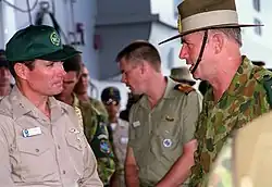United States Secretary of Defense William Cohen (left) meets members of the Australian Army in Darwin on 29 September 1999.