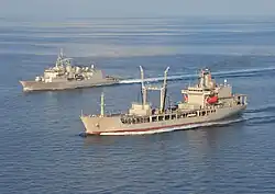 HMCS Protecteur (left) in 2014 with the tugboat USNS Sioux