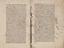 ![]() Manuscript of Ibn Jinni's Al-Mu'arrab (406 AH) held by the King Abdulaziz Public Library, Riyadh. The manuscript, written in Maghribi script, is a commentary on the Qawafi of al-Akhfash. | |
