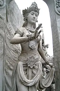 Ibu Pertiwi (English: Mother Prithvi or Mother Earth)[1] is a national personification of Indonesia, the allegory of Tanah Air (Indonesian: land and water), the Indonesian motherland. Since prehistoric times, the tribes of the Indonesian archipelago often revered earth and nature spirits as a life giving mother, a female deity of nature. After the adoption of Hinduism in the early first millennium, this mother figure was identified with Prithvi, the Hindu mother goddess of the earth, who was thus given the name "Pertiwi".
