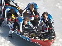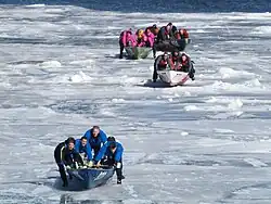 Originally a means of winter transport between the islands and shores of the Saint Lawrence River, ice canoeing is now a sport. Crews of five athletes alternately push their canoe across the ice on the frozen parts of the river, and paddle in a river with currents of four knots, tides of over 15 feet, and ice blocks weighing a few tonnes blown by the wind.[1] Shoes with bolts screwed to the bottom are worn to keep their traction on the ice.[2]
