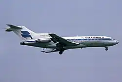In 1967, Flugfélag was the first Icelandic airline to join the jet age, when a Boeing 727-100 dubbed Gullfaxi was put into service. The B-727 jet aircraft was operated from Keflavík Airport, as the aircraft was considered too large for the smaller Reykjavík Airport. Most of Flugfélag's international operations transferred to Keflavík by this time. This left only shorter-distance flights to Greenland and the Faroes as the only international services from Reykjavík Airport.[17] Another 727 was acquired in 1971, and the aircraft type was operated until 1990.[18] In 2008, the cockpit section of Gullfaxi was put on display at the Akureyri Aviation Museum.[19]