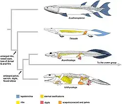 Ichthyostega, from Ancient Greek ἰχθύς (ikthús), meaning "fish", and στέγη (stégē), meaning "roof", is an extinct genus of limbed tetrapodomorphs from the Late Devonian of what is now Greenland. It was among the earliest four-limbed vertebrates ever in the fossil record and was one of the first with weight-bearing adaptations for terrestrial locomotion. Ichthyostega possessed lungs and limbs that helped it navigate through shallow water in swamps. Although Ichthyostega is often labelled a 'tetrapod' because of its limbs and fingers, it evolved long before true crown group tetrapods and could more accurately be referred to as a stegocephalian or stem tetrapod. Likewise, while undoubtedly of amphibian build and habit, it is not a true member of the group in the narrow sense, as the first modern amphibians (members of the group Lissamphibia) appeared in the Triassic Period. Until finds of other early stegocephalians and closely related fishes in the late 20th century, Ichthyostega stood alone as a transitional fossil between fish and tetrapods, combining fish and tetrapod features. Newer research has shown that it had an unusual anatomy, functioning more akin to a seal than a salamander, as previously assumed.[3]
