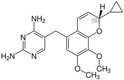 In vitro, iclaprim is active against methicillin-resistant Staphylococcus aureus (MRSA), vancomycin-resistant Staphylococcus aureus (VRSA), strains of Streptococcus pneumoniae resistant to several common antibiotics, and some Gram-negative bacteria.[4] It is of the diaminopyrimidine dihydrofolate reductase (DHFR)-inhibiting type.