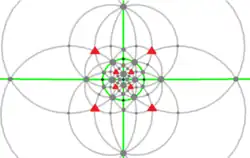 The pyritohedral symmetry is an index 5 subgroup of icosahedral symmetry, with 3 orthogonal green reflection lines and 8 red order-3 gyration points. There are 5 different orientations of pyritohedral symmetry.