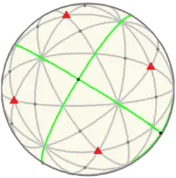 The edges of a spherical compound of five octahedra represent the 15 mirror planes as colored great circles. Each octahedron can represent 3 orthogonal mirror planes by its edges.