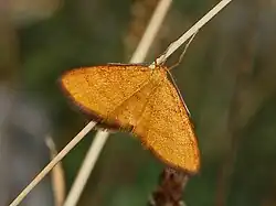 Idaea flaveolaria has a wingspan of 12–14 millimetres (0.47–0.55 in) in females and 14–18 millimetres (0.55–0.71 in) in males. The basic color of the wings is bright brown orange. On the forewings and hindwings there are two brown transversal lines, often almost indistinct. These transversal lines appear more clearly on the underside of the wings, together with a dark discal spots. The edge of the wings shows a blackish fringe.[3]