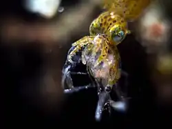 Most research into Idiosepius feeding behaviour has mainly been studied in I. paradoxus and has been categorized into attacking and eating phases.[7] Pygmy squids attack prey in a similar fashion to cuttlefish, and once their prey has been captured, the squid inserts the buccal mass into the exoskeleton or skin.[7][17] Once the buccal mass has been inserted, the squid releases cephalotoxin to paralyze the prey, and enzymes to externally digest the flesh.[17] Pygmy squids typically only predate on smaller prey like shrimp, as larger prey can not be paralyzed and are only partially digested.[17] These squids are able to digest so much of the flesh of a shrimp, that what remains often resembles what is left after a moult.[17] I. paradoxus has been observed to sometimes ink during predation, which may function as a type of smoke screen or distraction when catching active prey.[18]