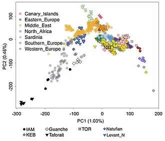 The ancient Guanches (c. 500 BCE - 1500 CE) of the Canary Islands were modeled as a mixture of ancestry from the Ifri N'Amr ou Moussa and Kelif el Boroud,[5] with a majority shared component of 80.2% coming from these mainland communities.[6]