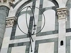 For much of his time in Florence, Danti resided at the convent of Santa Maria Novella, and designed the quadrant and the armillary sphere that appear on the end blind arches of the lower facade of the church in 1572 and 1574, on the right and left respectively. He also designed a large-scale gnomon for the church which allowed a thin beam of light to enter the church at noon each day through a hole just beneath the facade's rose window,[3] although it probably was not completed by the time Danti left Florence.