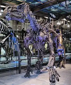 The largest find of Iguanodon remains to that date occurred on 28 February 1878 in a coal mine at Bernissart in Belgium, at a depth of 322 m (1,056 ft),[28] when two mineworkers, Jules Créteur and Alphonse Blanchard, accidentally hit on a skeleton that they initially took for petrified wood. With the encouragement of Alphonse Briart, supervisor of mines at nearby Morlanwelz, Louis de Pauw on 15 May 1878 started to excavate the skeletons and in 1882 Louis Dollo reconstructed them. At least 38 Iguanodon individuals were uncovered,[29] most of which were adults.[30] In 1882, the holotype specimen of I. bernissartensis became one of the first ever dinosaur skeletons mounted for display. It was put together in a chapel at the Palace of Charles of Lorraine using a series of adjustable ropes attached to scaffolding so that a lifelike pose could be achieved during the mounting process.[17] This specimen, along with several others, first opened for public viewing in an inner courtyard of the palace in July 1883. In 1891 they were moved to the Royal Museum of Natural History, where they are still on display; nine are displayed as standing mounts, and nineteen more are still in the Museum's basement.[28] The exhibit makes an impressive display in the Royal Belgian Institute of Natural Sciences, in Brussels. A replica of one of these is on display at the Oxford University Museum of Natural History and at the Sedgwick Museum in Cambridge. Most of the remains were referred to a new species, I. bernissartensis,[31] a larger and much more robust animal than the English remains had yet revealed. One specimen, IRSNB 1551, was at first referred to the nebulous, gracile I. mantelli, but is currently referred to Mantellisaurus atherfieldensis. The skeletons were some of the first complete dinosaur skeletons known. Found with the dinosaur skeletons were the remains of plants, fish, and other reptiles,[28] including the crocodyliform Bernissartia.[32]