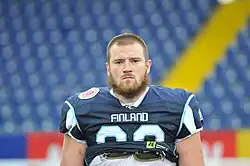 Iiro Luoto (born October 8, 1984) is a Finnish[1] gridiron football tight end for the Helsinki Roosters. Luoto was a international practice squad player for the New York Jets of the National Football League. He originally played for the Helsinki Roosters at the Vaahteraliiga (Maple league). He then played two seasons in NFL Europa before being assigned to the Jets in 2007. Luoto was transferred from Calanda Broncos to Helsinki Wolverines in February 2013. He has again played for the Roosters since 2014.