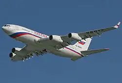 The Ilyushin Il-96 (Russian: Илью́шин Ил-96) is a Russian four-engined jet long-haul wide-body airliner designed by Ilyushin in the former Soviet Union and manufactured by the Voronezh Aircraft Production Association in Russia. It is powered by four high-bypass Aviadvigatel PS-90 twin-spool turbofan engines. As of 2024, the Il-96 is used as the main Russian presidential aircraft. The type's only remaining commercial operator in passenger service is Cubana de Aviación while Sky Gates Airlines operates a single cargo variant.