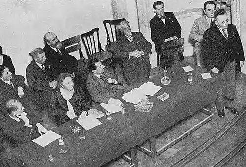 When Averescu refused to give in, the PS put into motion the 20 October general strike, with the peaceful slogan: "Everyone stays at home, we will hold no demonstrations so as not to leave room for the provocateurs."[39] Beyond this facade, the PS was torn by factionalism. The radical section made open calls for the party's transformation. In the theoretical organ Lupta de Clasă, there was already talk of forming "the vanguard party of the proletariat, the communist party".[39] Yet, as Moscovici explained in a 1922 essay, Problemele actuale ale mișcării socialiste ("Current Issues Facing the Socialist Movement"), "although ours is a revolutionary party, who realizes that Capitalist Society cannot be overturned in any other way but through a revolution—once our Society, like our proletariat, is ripened enough for it [Moscovici's italics]—, it would be an enormous mistake to maintain that the general strike has aimed to overthrow the current State's regime."[40] The socialists' attempt to "pressure" the government into reforming the labor legislation "failed, and we did not wish for a revolution."[41]