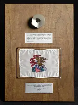 At the request of Nixon, NASA had about 250 presentation plaques made following Apollo 11 in 1969. Each included about four rice-sized particles of Moon dust from the mission totaling about 50 mg.[1][2] The Apollo 11 lunar sample display has an acrylic plastic button containing the Moon dust mounted with the recipient's country or state flag that had been to the Moon and back. All 135 countries received the display, as did the 50 states of the United States and the U.S. provinces and the United Nations.[1]