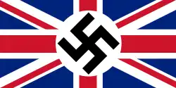 The IFL soon shifted away from Italian fascism (it originally used the fasces as its emblem) after Leese had met the Nazi Party propagandist Julius Streicher in Germany. Soon, antisemitism became the central theme of IFL policy and its new programme, the 'Racial Fascist Corporate State', stressed the supremacy of the 'Aryan race'.[7] The IFL altered its flag so that it featured the Union Flag superimposed with the swastika. As a result of that conversion, the IFL enjoyed a higher profile than its membership might suggest, in large part due to the funding that it received from Nazi Germany paid through the English correspondent for the Völkischer Beobachter, Dr. Hans Wilhelm Thost.[3] Indeed, by the mid-1930s the IFL had turned against the Italian model so much that it denounced Benito Mussolini as a "pro-Semite" and claimed that the Second Italo-Ethiopian War had been organised by Jews.[8]