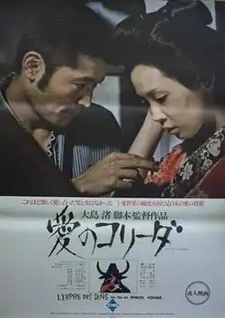 In the Realm of the Senses (French: L'Empire des sens, Japanese: 愛のコリーダ, Ai no Korīda, "Bullfight of Love"[1]) is a 1976 erotic art film written and directed by Nagisa Ōshima.[2][3] It is a fictionalised and sexually explicit treatment of a 1936 murder committed by Sada Abe.[4] An international coproduction of France and Japan, the film generated great controversy at the time of its release.[4] The film had the involvement of pink film luminary Kōji Wakamatsu as co-screenwriter and assistant producer.[5] While intended for mainstream wide release, the film contains scenes of unsimulated sexual activity between the actors (Eiko Matsuda and Tatsuya Fuji, among others).