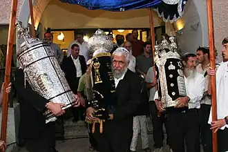 The Torah scroll is carried to its new home in an outdoor procession attended by men, women, and children.[11][24] The procession can take place by day or by night. This event can attract hundreds[25][26][27] and even thousands of participants.[28][29]